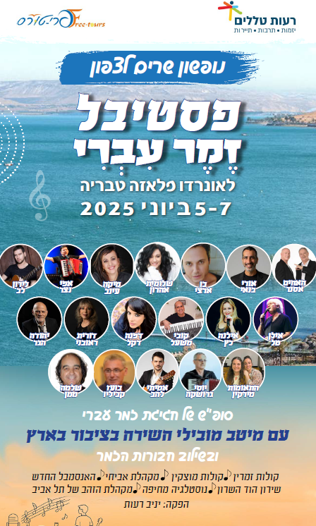 שלושה ימים של חוויה תרבותית איכותית, מהנה ומעשירה, באווירה קסומה ואירוח מפנק בבית המלון לאונרדו פלאזה בטבריה. במהלך הנופש נהנה ממופעי זמר עברי סוחפים ומלהיבים עם מיטב האומנים, חבורות הזמר ומובילי השירה בציבור האהובים – חגיגה ישראלית מרגשת ובלתי נשכחת!